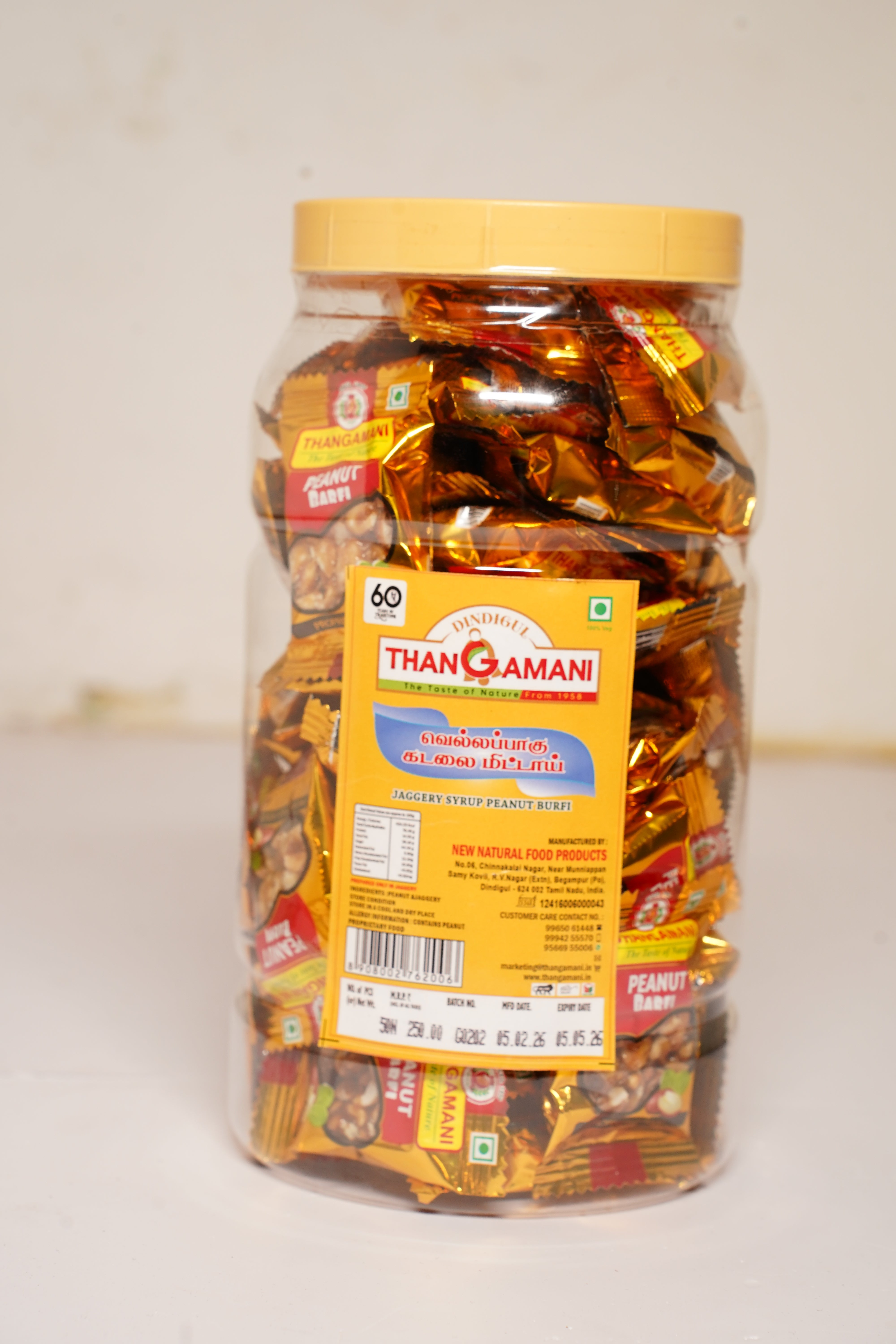Thangamani presents a nice bar with a mixture of peanuts and healthy jaggery. It contains 50 individual packets (each piece 10 grams approx) of kadalai Burfy. The famous peanut candy in bar form which an extraordinary taste and crunchy effect. Keep away from direct sunlight & keep in a dry & hygienic place.