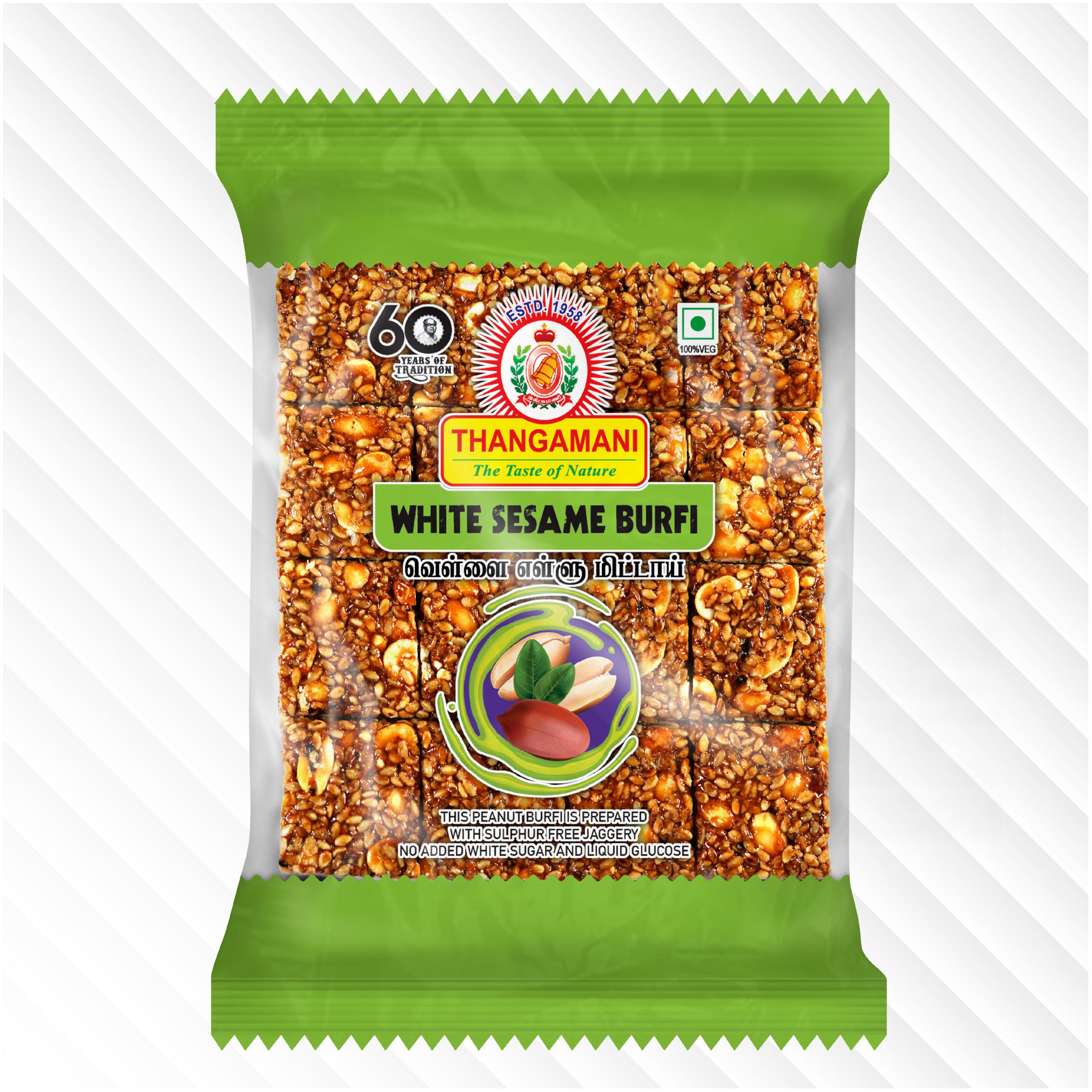 Thangamani presents an Ellu Mittai / Sesame Burfi / Sesame candy/sesame ladoo / ellu urundai / Sesame Balls is a crunchy and nutty sweet made primarily with sesame seeds and Jaggery. Ellu means Sesame seeds in Tamil. These burfi are so nutritious with the goodness of two healthy ingredients Sesame seeds and Jaggery (natural sugar substitute). Here the Sesame seeds are roasted, mixed with caramelized Jaggery and then made into burfi or balls. Ellu Mittai is a part of South Indian tradition to make them for festive seasons to bring goodness and happiness throughout the year. Keep away from direct sunlight & keep in a dry & hygienic place.
